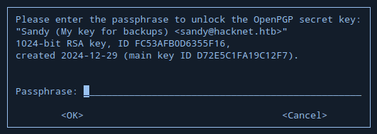 uid [ultimate] Sandy (My key for backups) <sandy@hacknet.htb>