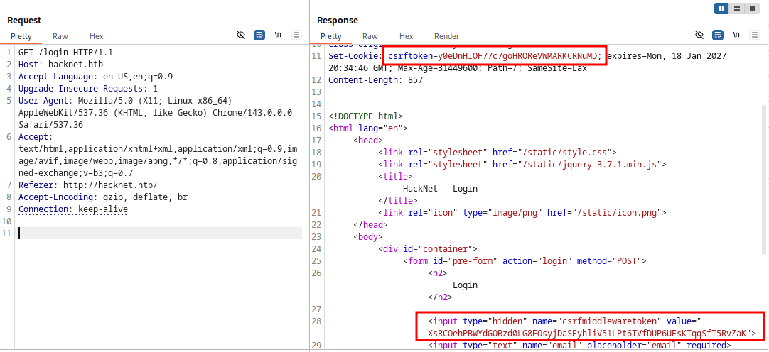 Nmap wykrył przekierowanie do hacknet.htb. Jak zawsze w takim przypadku, dodajemy tę domenę do pliku /etc/hosts dla łatwiejszej interakcji z usługą http.