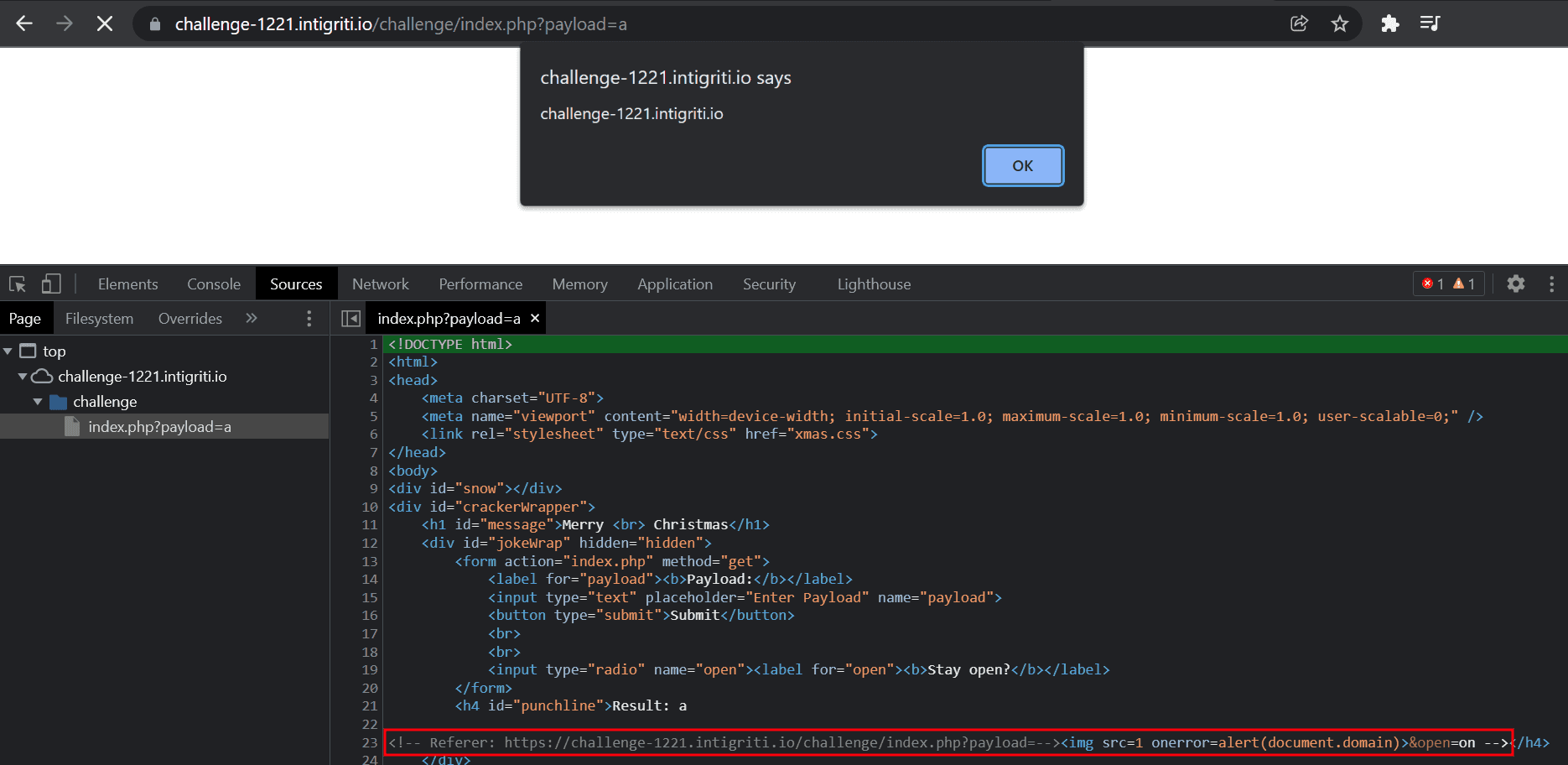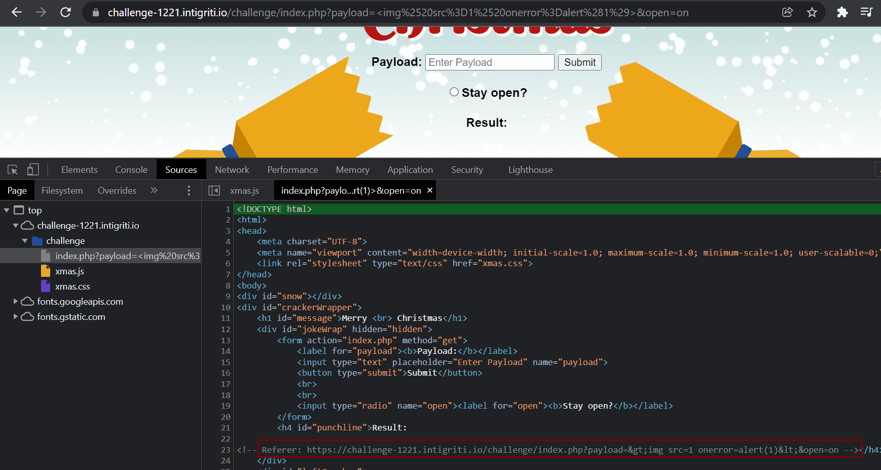 On the 20th December 2021 Intigriti launched a new XSS challenge, created by @E1u5iv3F0x. The goal is to find a way to execute arbitrary javascript on the https://challenge-1221.intigriti.io/ page.