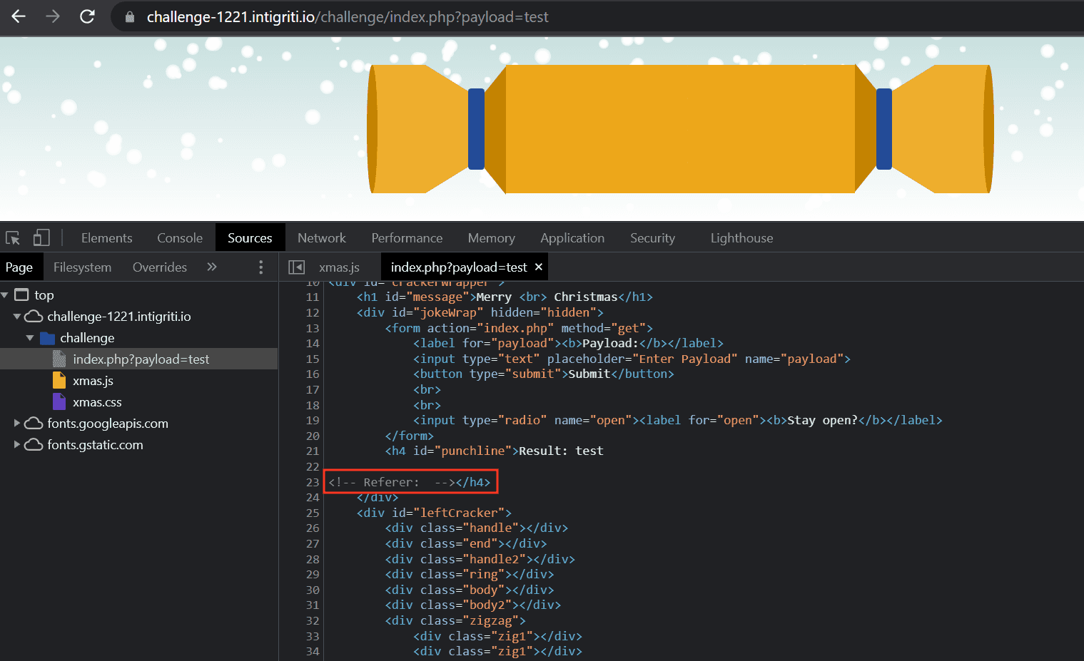 If we put any value in the payload query parameter, the challenge page will reflect Referer header in the response inside html comment.